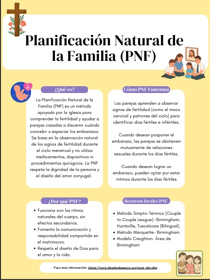 La Planificación Familiar Natural (PFN) es una forma segura, eficaz y natural de comprender y respetar el diseño de Dios para la fertilidad y la vida familiar. Los métodos de PFN se basan en la observación de los signos naturales de fertilidad en el ciclo de la mujer y pueden utilizarse para lograr o posponer un embarazo, sin el uso de medicamentos ni dispositivos.